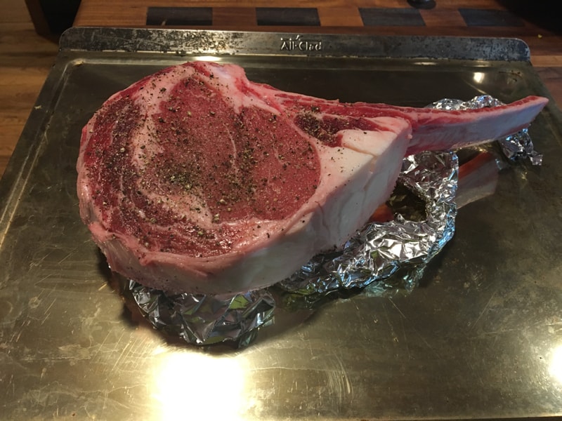 This is the biggest, most bad-ass chop you can get. The cowboy chop! Reminiscent of entrees on the "Flintstones," and demonstrating the Reverse Cook method.Here is a tutorial on how to do it. If you have a temp probe you can't miss on this one. I baked it then seared it in ghee (clarified butter). You could also finish it on a really hot grill and avoid the smoke from searing in your kitchen.
